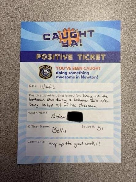 A cornerstone of the SRO program is reinforcing positive behavior. Officer Bellis proudly participates in the Positive Ticket initiative, created by The Center for Prevention and Counseling. Positive Tickets are awarded to students who are observed demonstrating kindness, responsibility, respect, and positive decision-making. This program allows officers to recognize positive actions while strengthening trust and positive relationships between youth and law enforcement.