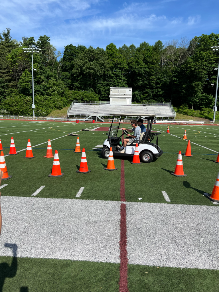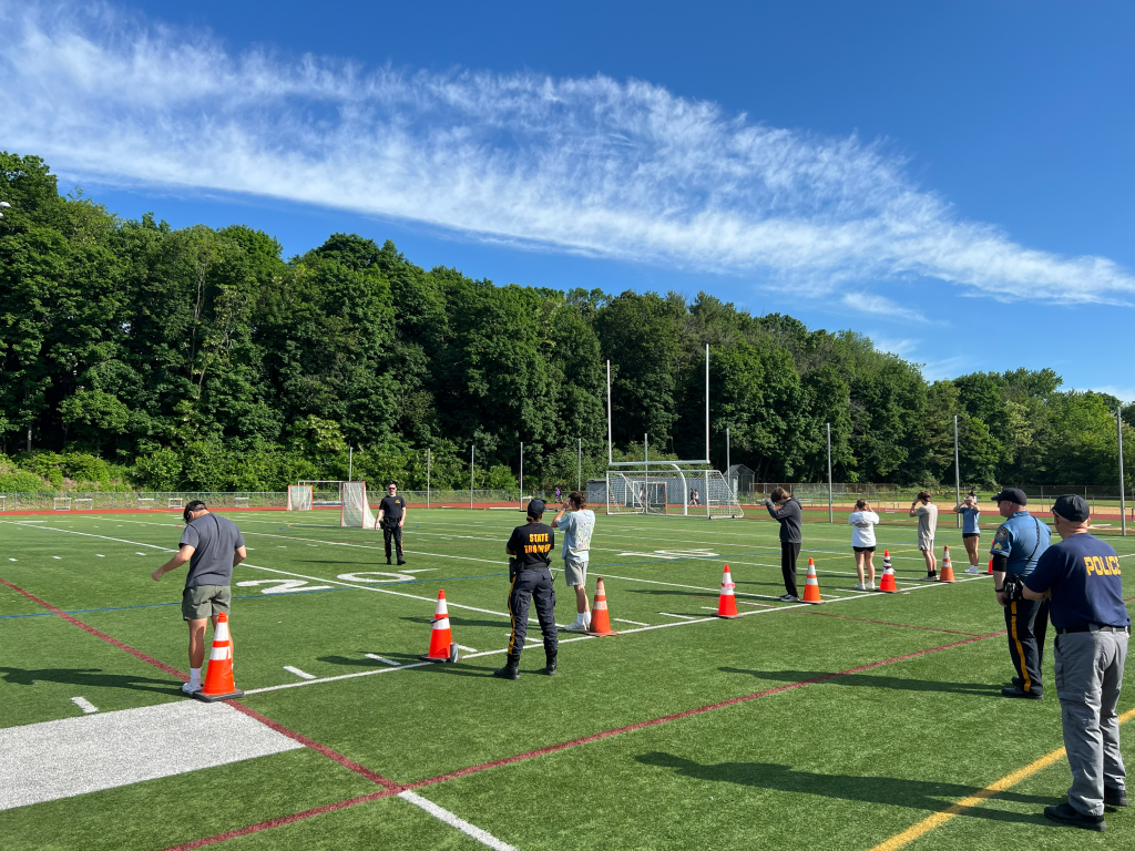 Each year, Officer Bellis meets with the Junior and Senior classes during Prom Week to speak about the dangers of impaired driving and the importance of never drinking and driving. To reinforce this message, he coordinates a hands-on drunk driving simulation on the high school football field, where students navigate a course using golf carts while wearing drunk goggles. This safe but impactful exercise demonstrates how alcohol impairs judgment, coordination, and reaction time.